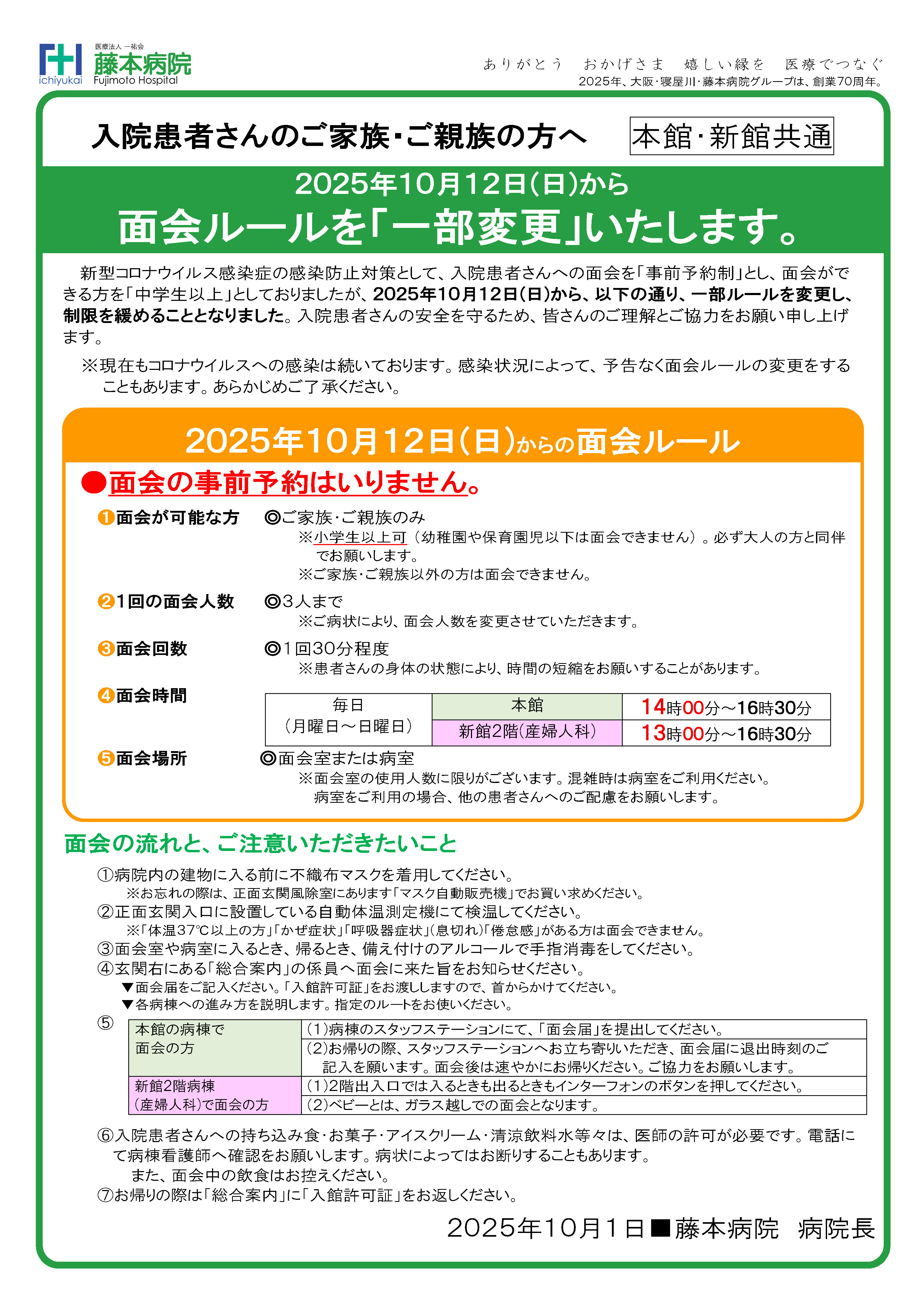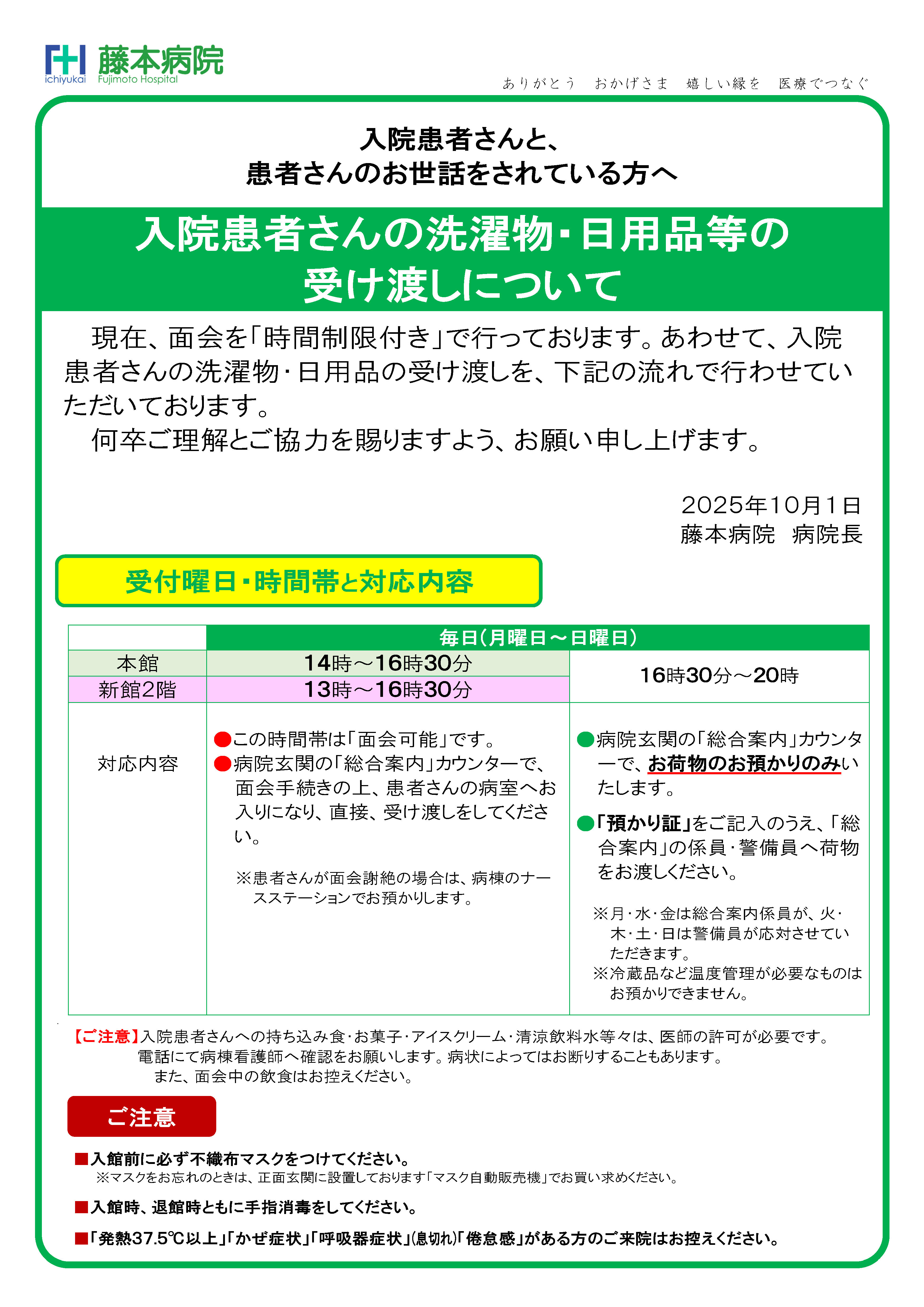 2025年10月12日(日)より面会ルールを「一部変更」致します。あわせて入院患者さんの洗濯物・日用品の受け渡しを下記の流れで行わせていただきます。詳しくは下記をご覧ください。